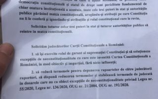 O noua etapă în continuarea Protestului din 2 Octombrie - Lupta continuă prin toate mijloacele legaleÎn data de 6 Octombrie 2021, principalii organizatori ai protestului desfasurat pe 2 Octombrie 2021 în Piata Victoriei au depus un Memoriu oficial cu o serie de solicitari clare și bine fundamentate către Curtea Constituțională a României. Iata Preambulul documentului depus, cu principalele solicitari formulate catre